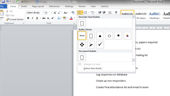 There are different styles of bullet points to choose from, and if you want to experiment with these – click on the down arrow next to the bullet point on the ribbon. Select “Define New Bullet” and select the shape you want.