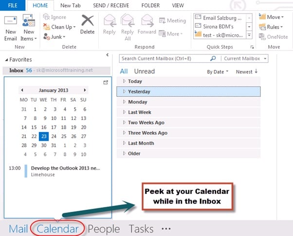 The Folder Pane and the Peek feature provide quick and convenient ways to open your email, calendar, contacts, and tasks. One of the new features in Outlook 2013 is the ability to peek at the details of the other Outlook objects such as Calendar, Tasks and Email.