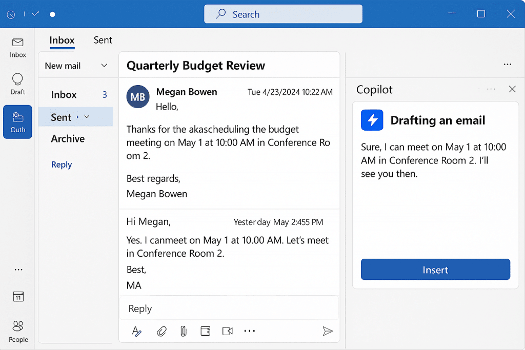 Copilot in Outlook composes emails, condenses conversation threads, and analyses attachments such as PDFs via advanced search for summaries. This is particularly useful for executives managing high volumes of correspondence.