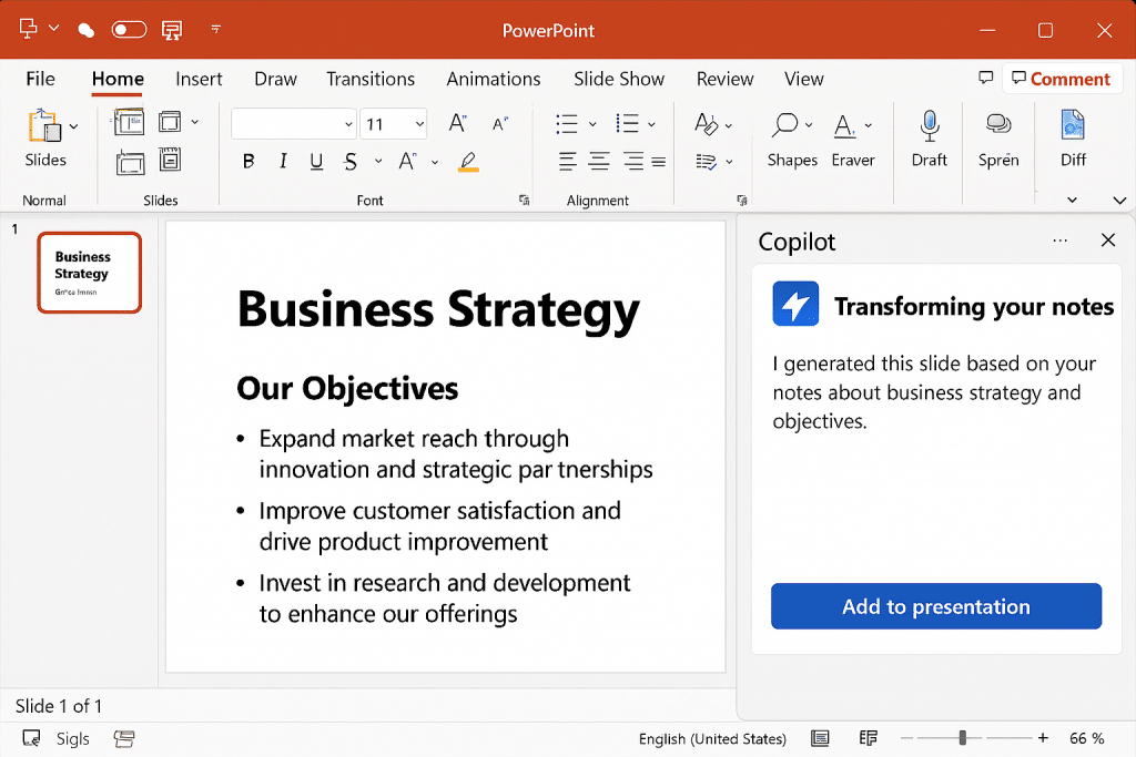 Copilot in PowerPoint constructs slides from outlines, suggesting designs, images, and speaker notes. 2025 features include direct import of mobile photos and AI-generated audio summaries for previews, ideal for sales presentations or executive briefings.