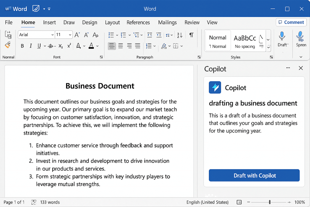 Copilot in Word functions as an intelligent collaborator, assisting with drafting documents, summarising extensive content, and proposing revisions. Enhancements in 2025 include interactive chat features for refining output and audio playback of responses, facilitating reviews while mobile. It is particularly effective for producing business reports or proposals, incorporating data from organisational files to generate coherent content.