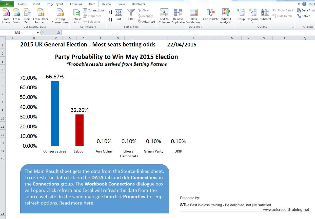 There are so many sources from which to gain the latest on likely election winners, and one such are the bookies. There are some great websites with up to the minute odds on all the political parties and it got us thinking wouldn’t it be great to capture and analyse this information in Excel….