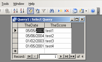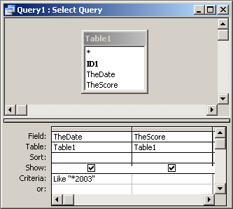 Alternatively, you can run a query with no criteria, select the text '2003' with your mouse under your date field, and press the Filter By Selection button on the toolbar.
