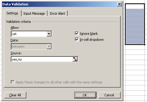You will now get a drop-down box for each cell you have applied this validation to. You can also type 'yes' or 'no' when filling in these cells, but if you enter something else (eg. 'cat'), then Excel will give the user an error, and ask them to try again.