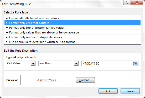 I am wanting to highlight cells that contain a date that is >=-30 days from todays date i.e. commence highlighting 30 days prior to the date reaching todays date.
