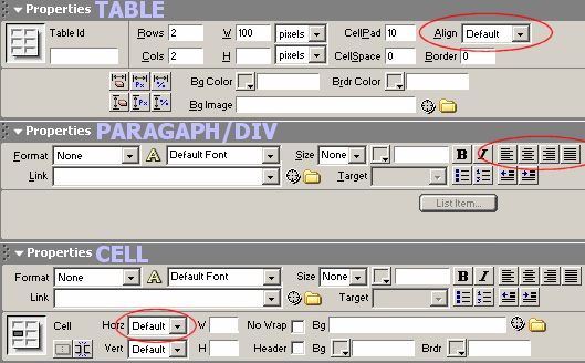 To do this in Dreamweaver, it's also on the properties panel, but each alignment option is a button like you'd see on Microsoft Word. If you are in a Paragraph tag, it will attempt to align the paragraph, like this: