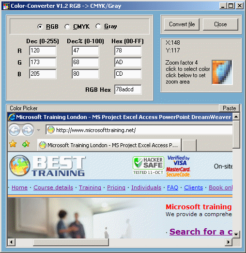 Now go back to the Color-Converter window and press the Paste button on the middle right. Your screenshot should appear in the bottom of the Color Converter area. You can now scroll around your screenshot until you can see the colour you want to pick. Click your mouse on the colour, and you will see an zoomed enlargement at the top right of Color Converter. You can now click the zoomed area to ensure you get the exact pixel colour you're after.