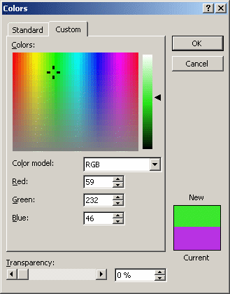 Now go to Powerpoint and find or insert your autoshape. Right click the autoshape and choose Format AutoShape. Ensure you're on the Colours and Lines tab. At the top, under 'Fill' section, there is a colour drop down box. Click this, and choose 'More Colours' from the drop-down options. The 'Colours' dialogue box appears. Now you can see the R, G and B boxes again. Enter each number you wrote down from Color Converter window. Press OK, and then OK again.